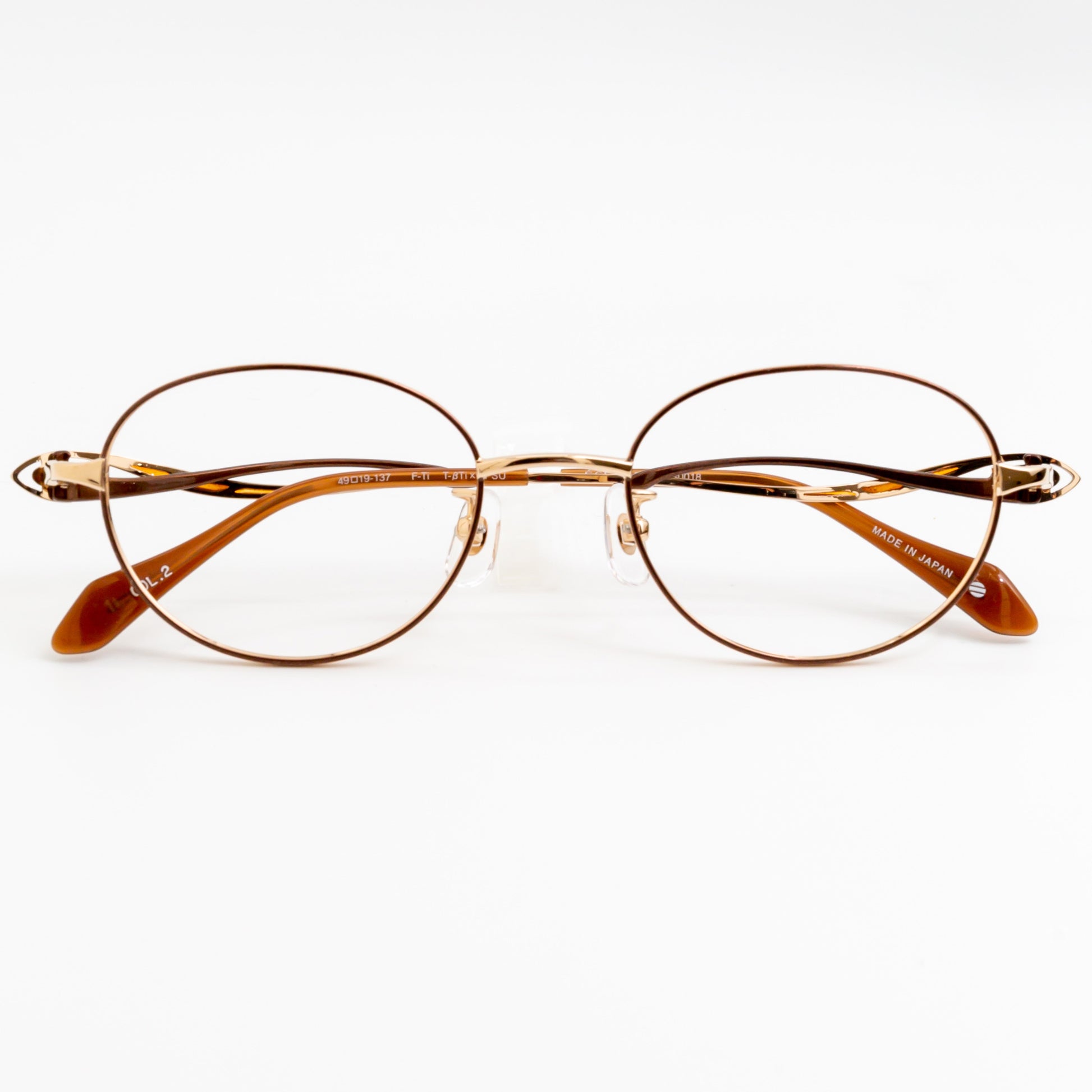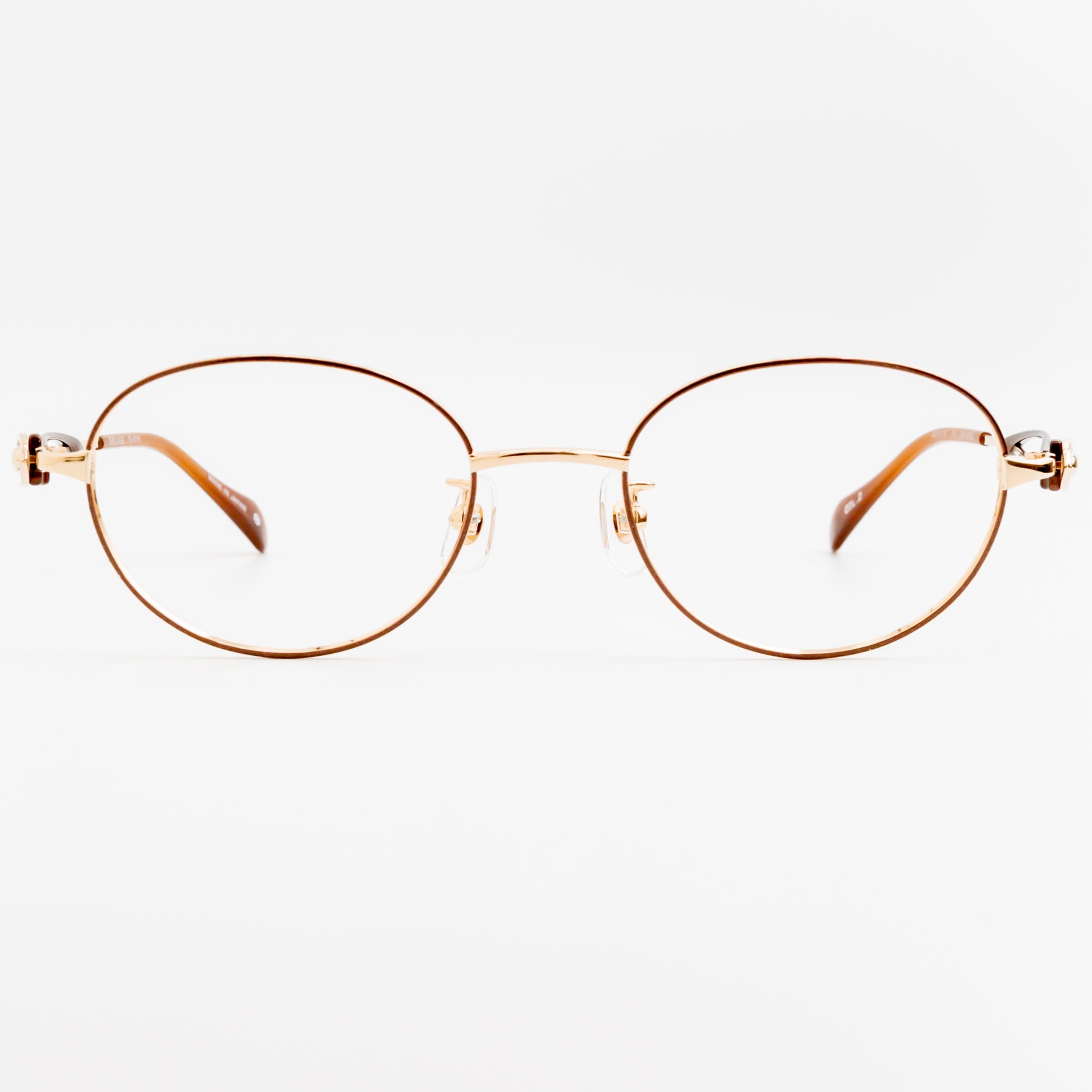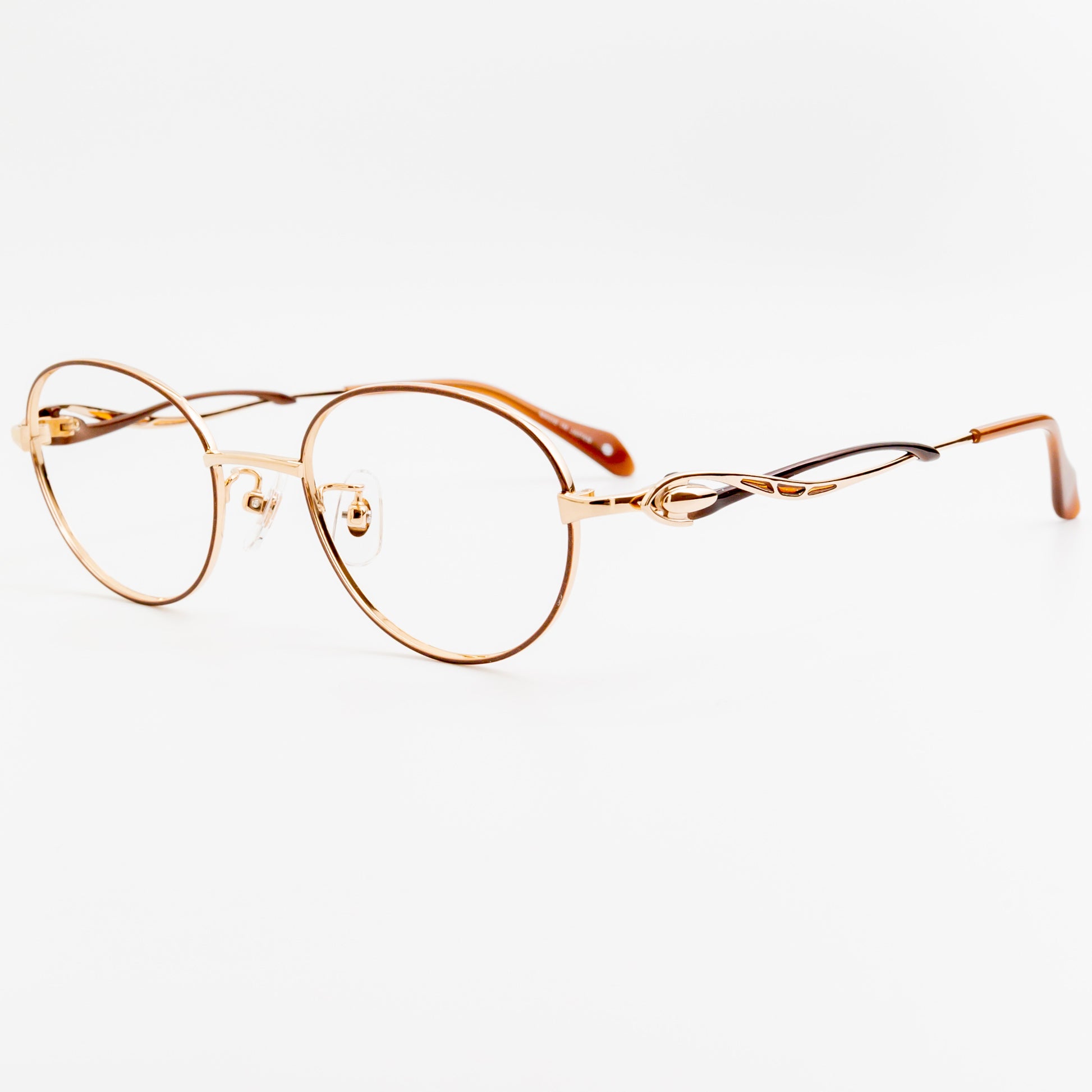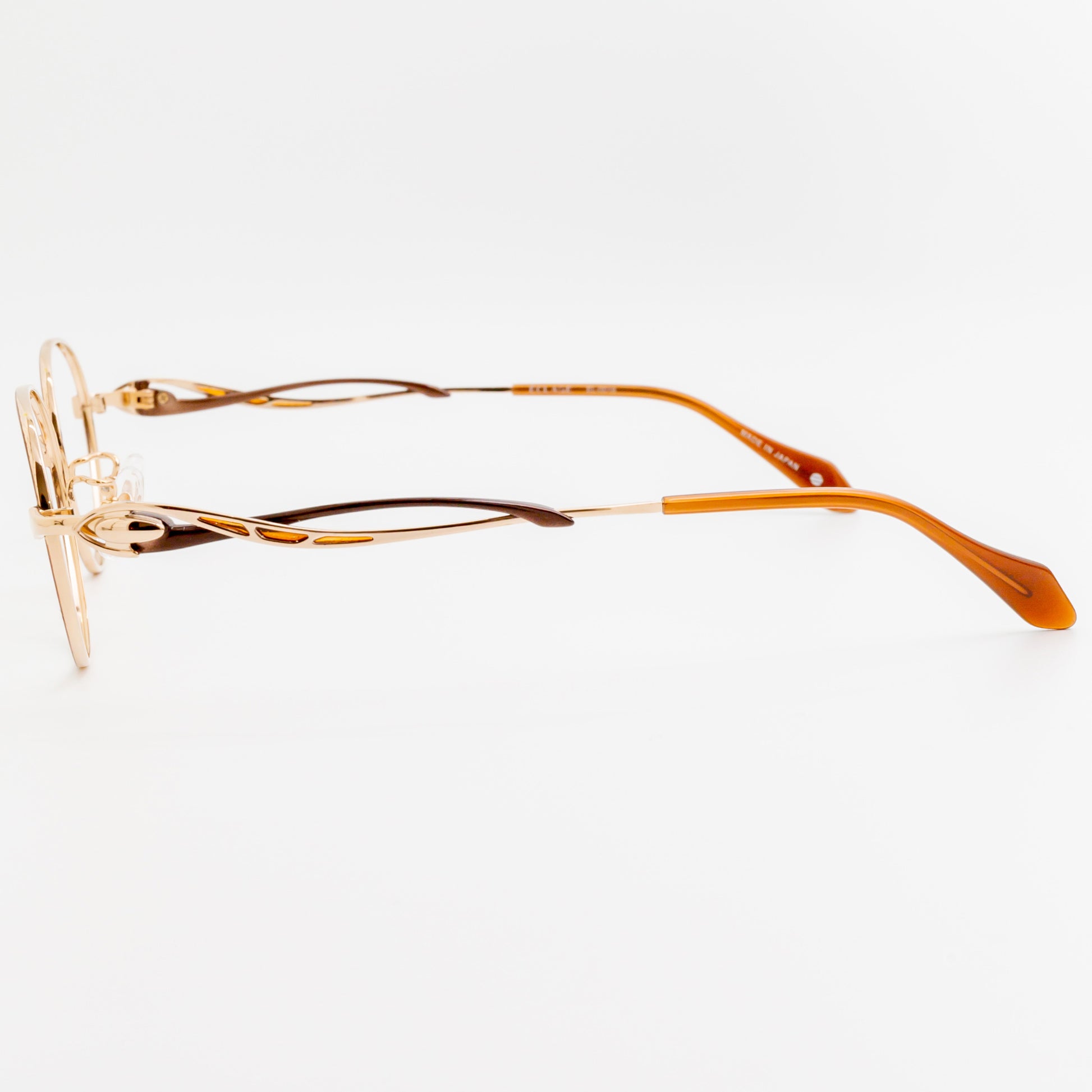 メタルと樹脂の異素材からなる曲線が立体的に交差しており、柔らかく頭にフィットする機能性があるフレームになっています。テンプルにはステンド七宝を施し、より彩り豊かな印象を与えることができます。