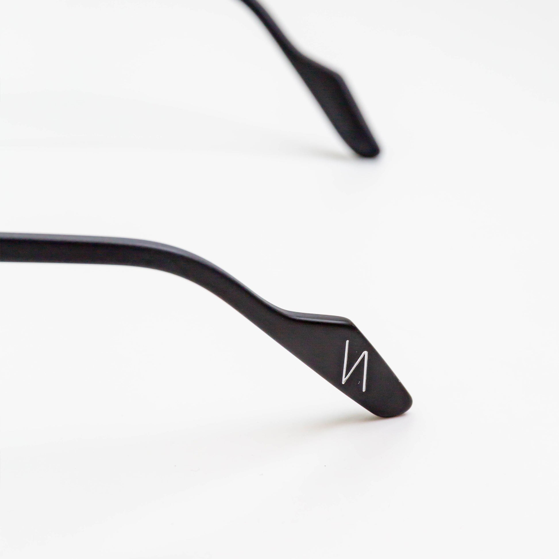 スリムなアセテテンプルが全体を引き締める、モードな一本。