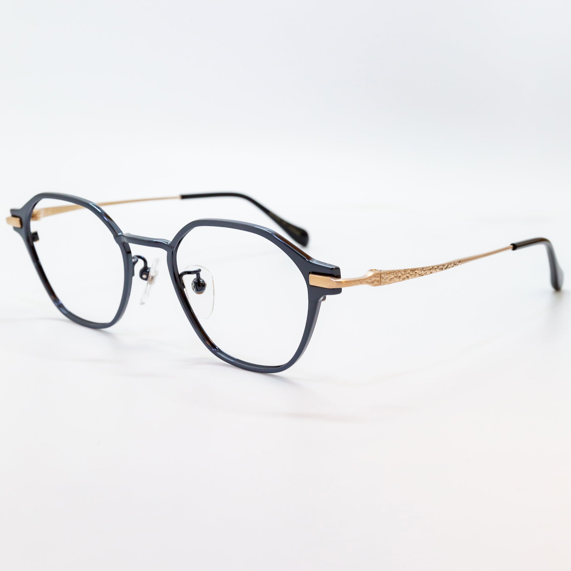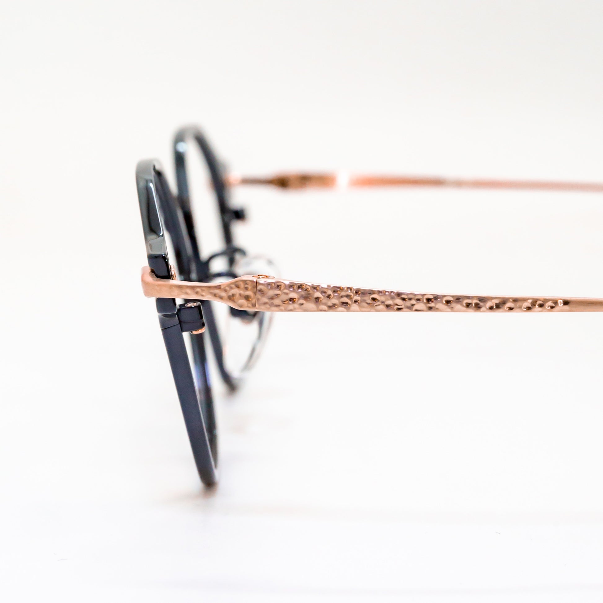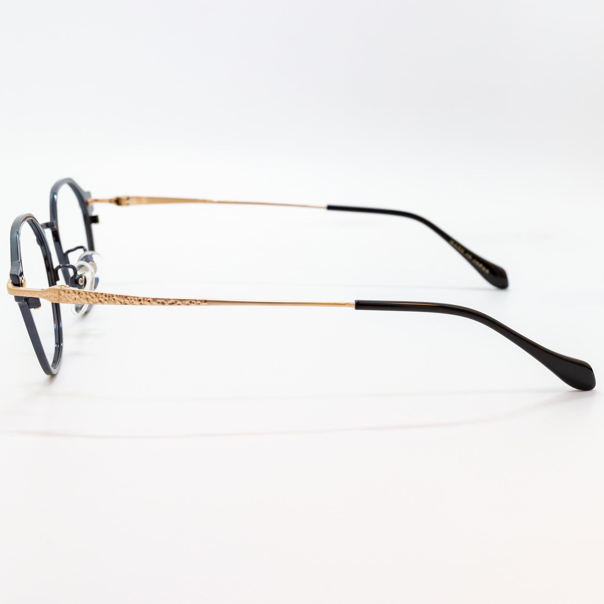 このブランドは、鯖江の伝統的な眼鏡加工技術を最大限に活かしています。冷間プレスによるチタン材加工では、しっかりとした強度と粘りを実現。さらに、精密なマシニング機械の加工と職人の手技による槌目模様が特徴で、機械では再現できない独特の質感を生み出しました。