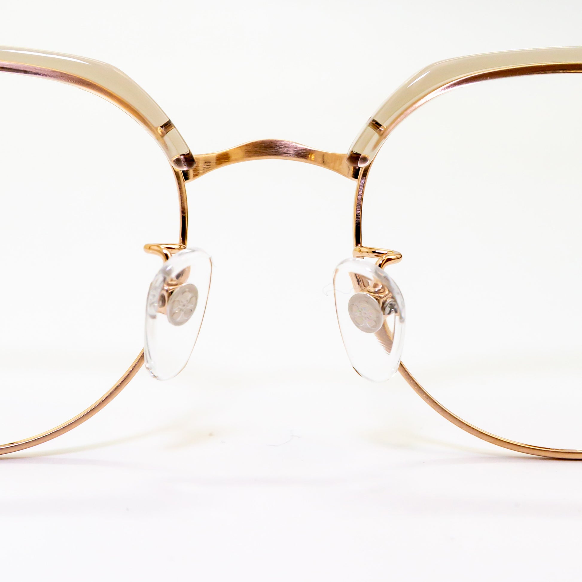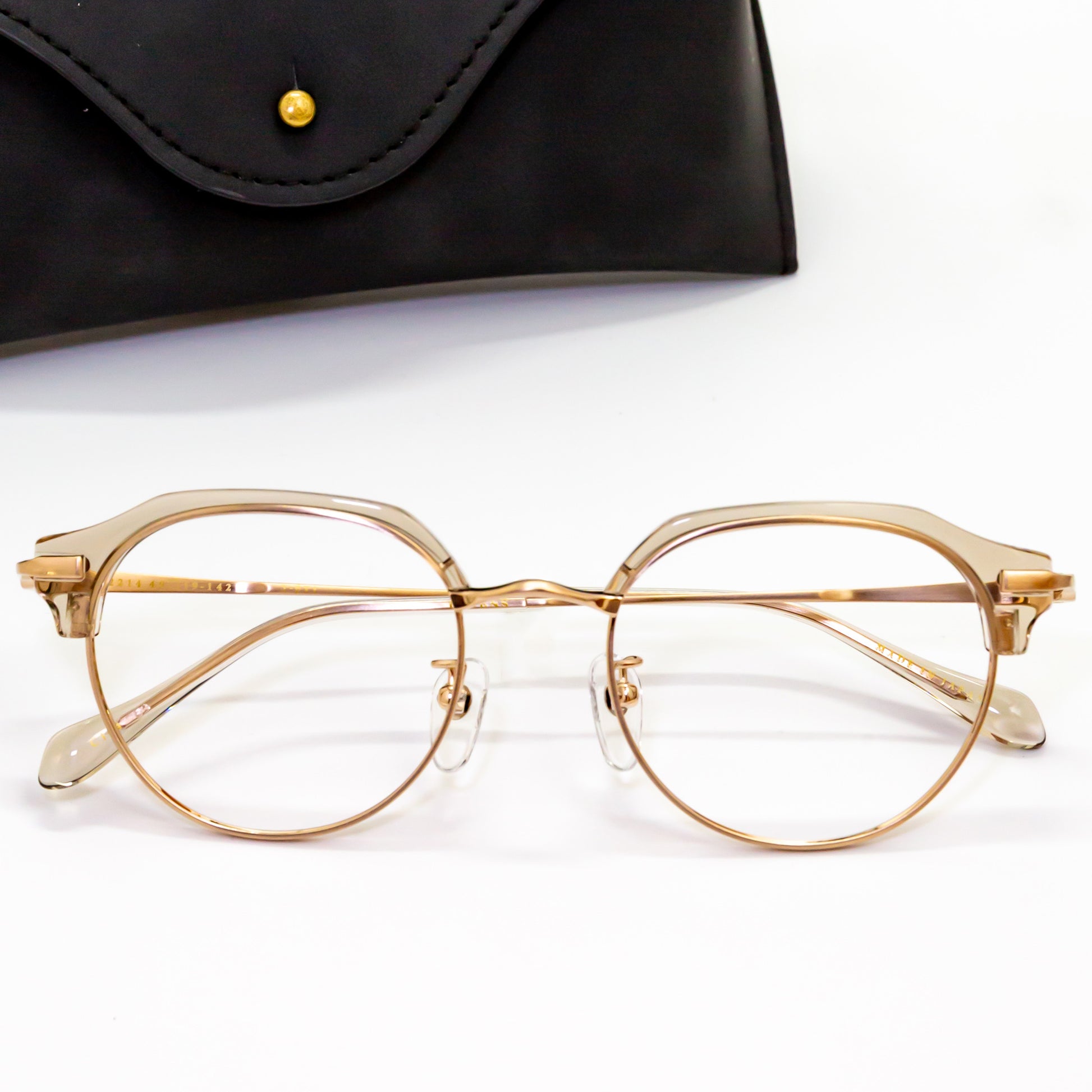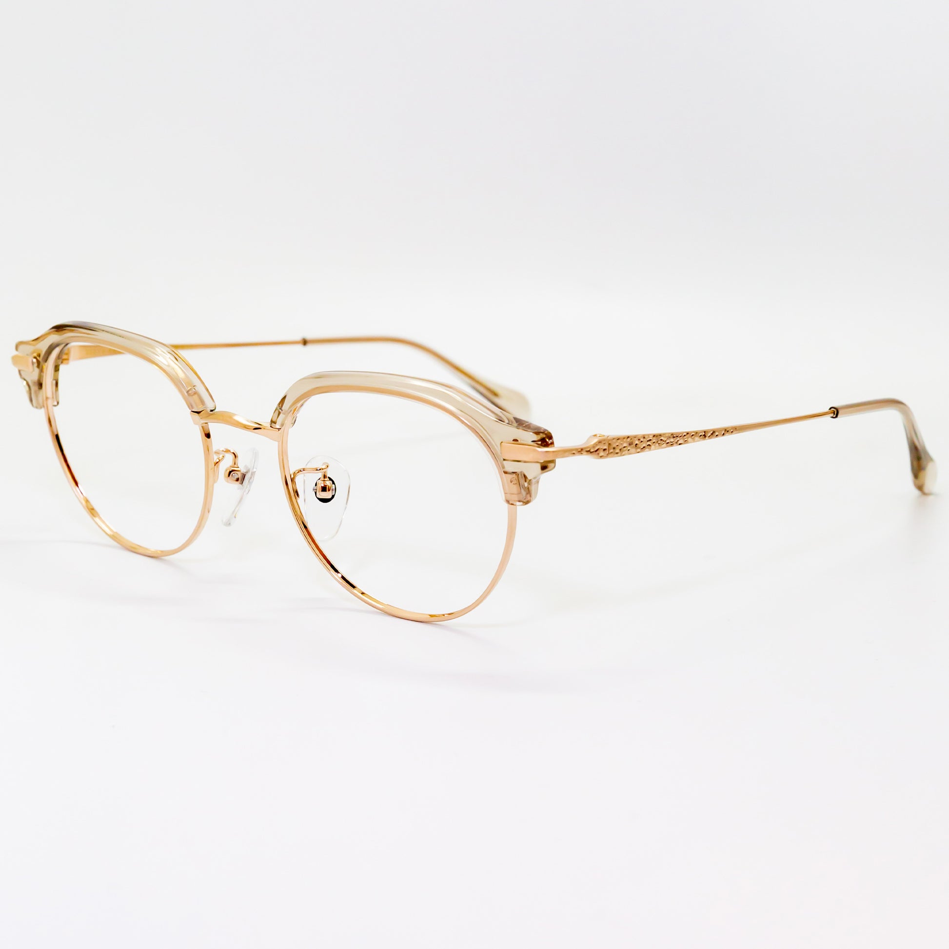 また、鼻パッド芯にはオリエント眼鏡社長の梅田家の家紋「加賀梅鉢紋」を採用し、日本文化と伝統を取り入れた象徴的なデザインを施しています。S2201モデルでは、チタンフルリム仕様によりレンズの厚みを隠し、重たい印象をスマートに見せる設計が採用されています。一方、S2202・S2203モデルでは、冷間一体プレス方式により溶接箇所を最小限に抑えた強固な構造を実現。見た目の美しさだけでなく、耐久性にも優れています。