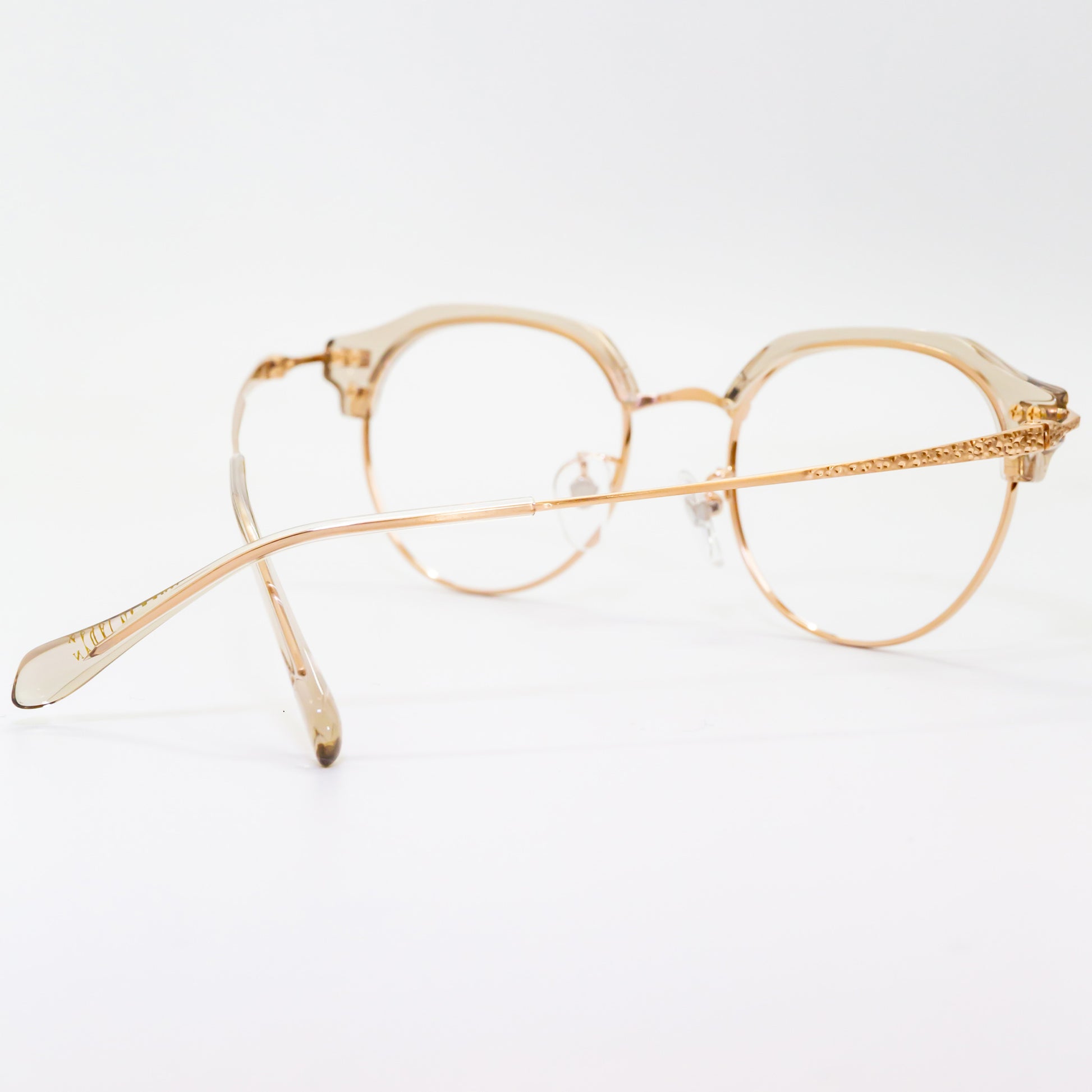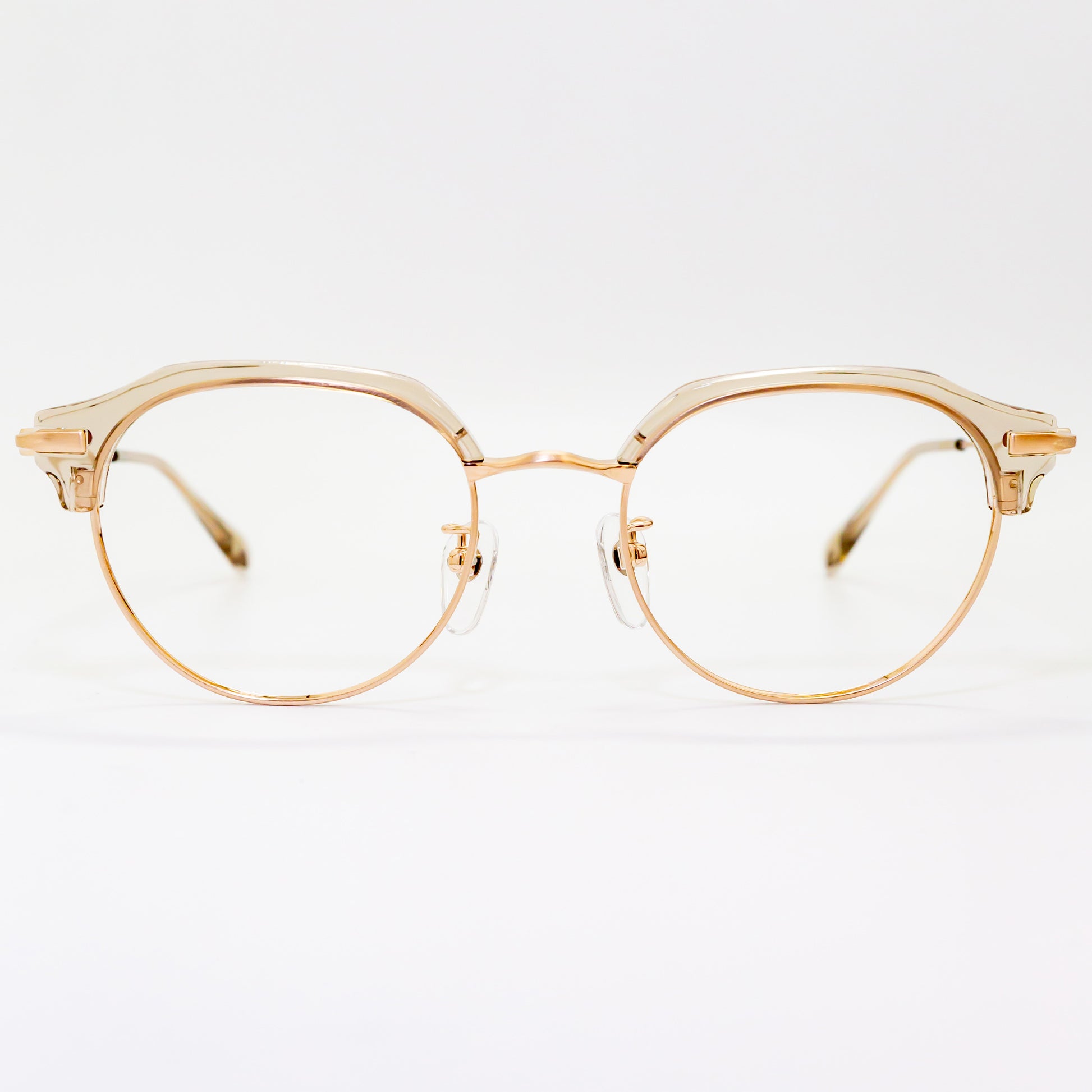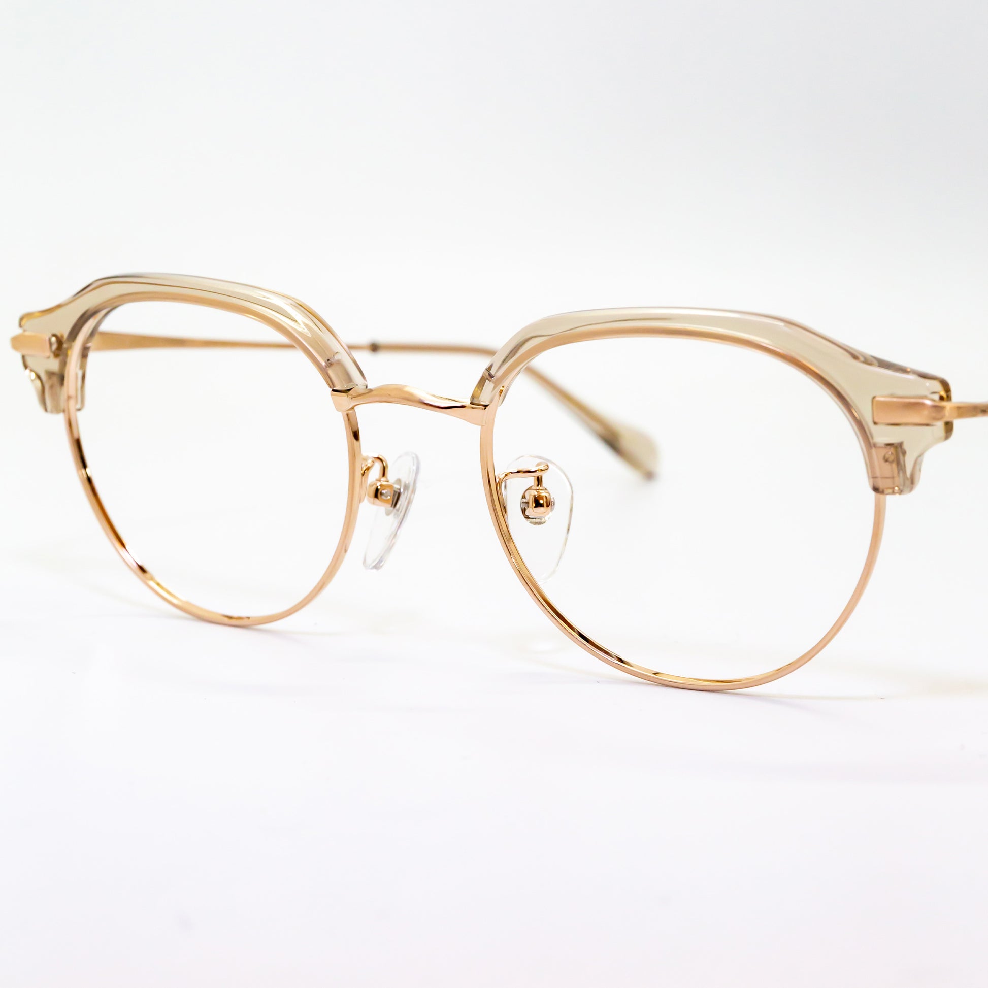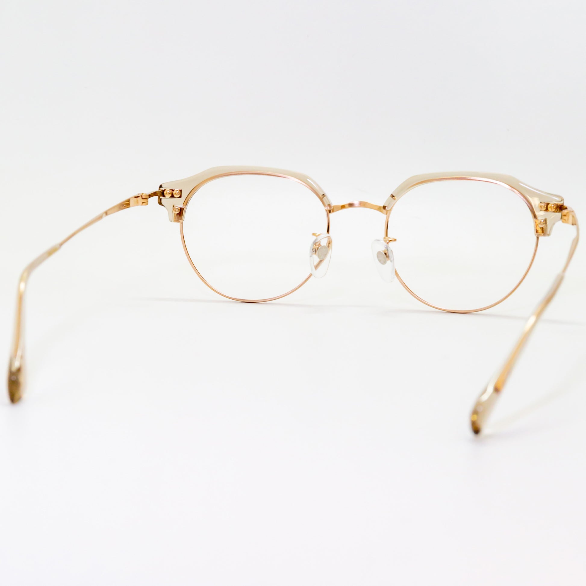 また、鼻パッド芯にはオリエント眼鏡社長の梅田家の家紋「加賀梅鉢紋」を採用し、日本文化と伝統を取り入れた象徴的なデザインを施しています。S2201モデルでは、チタンフルリム仕様によりレンズの厚みを隠し、重たい印象をスマートに見せる設計が採用されています。一方、S2202・S2203モデルでは、冷間一体プレス方式により溶接箇所を最小限に抑えた強固な構造を実現。見た目の美しさだけでなく、耐久性にも優れています。