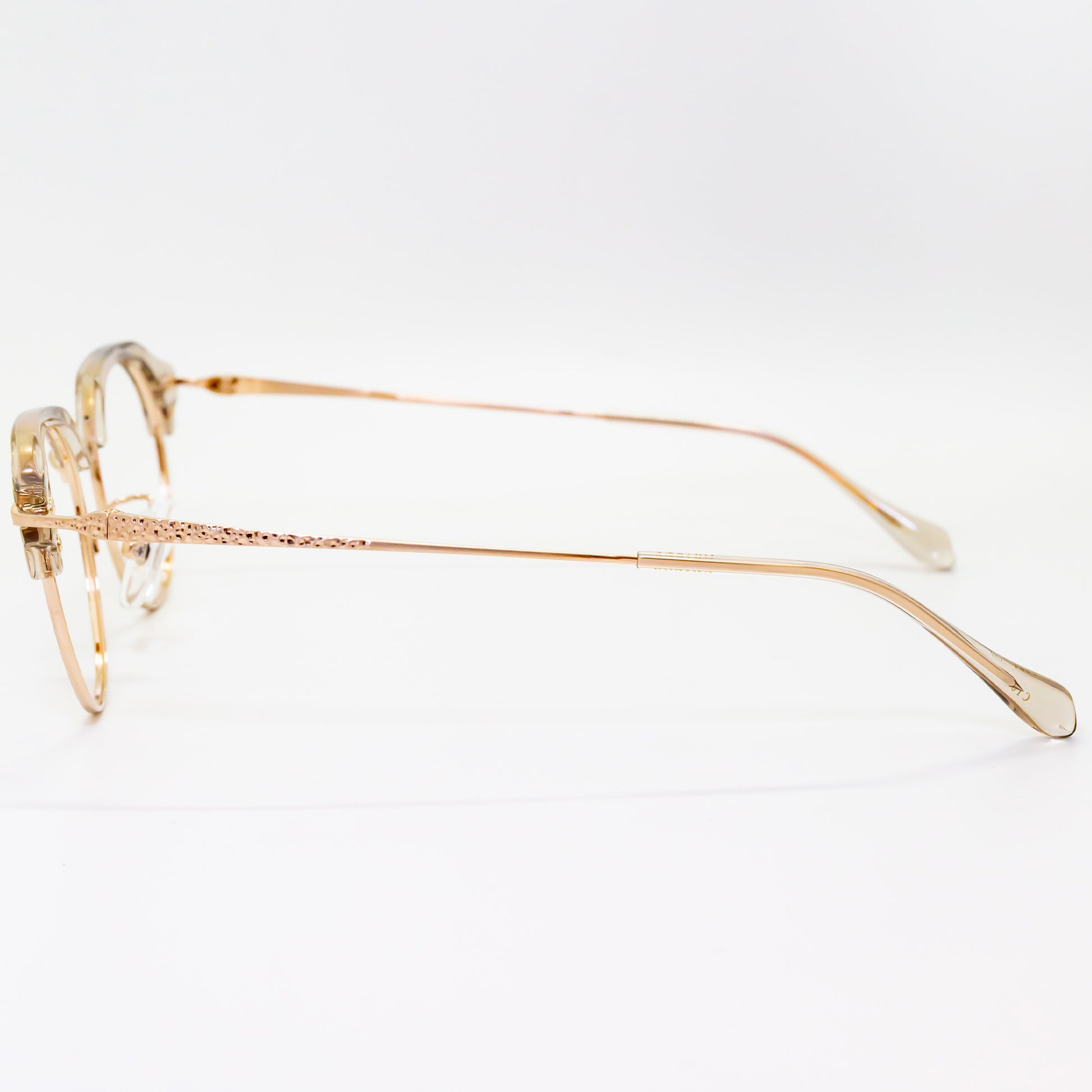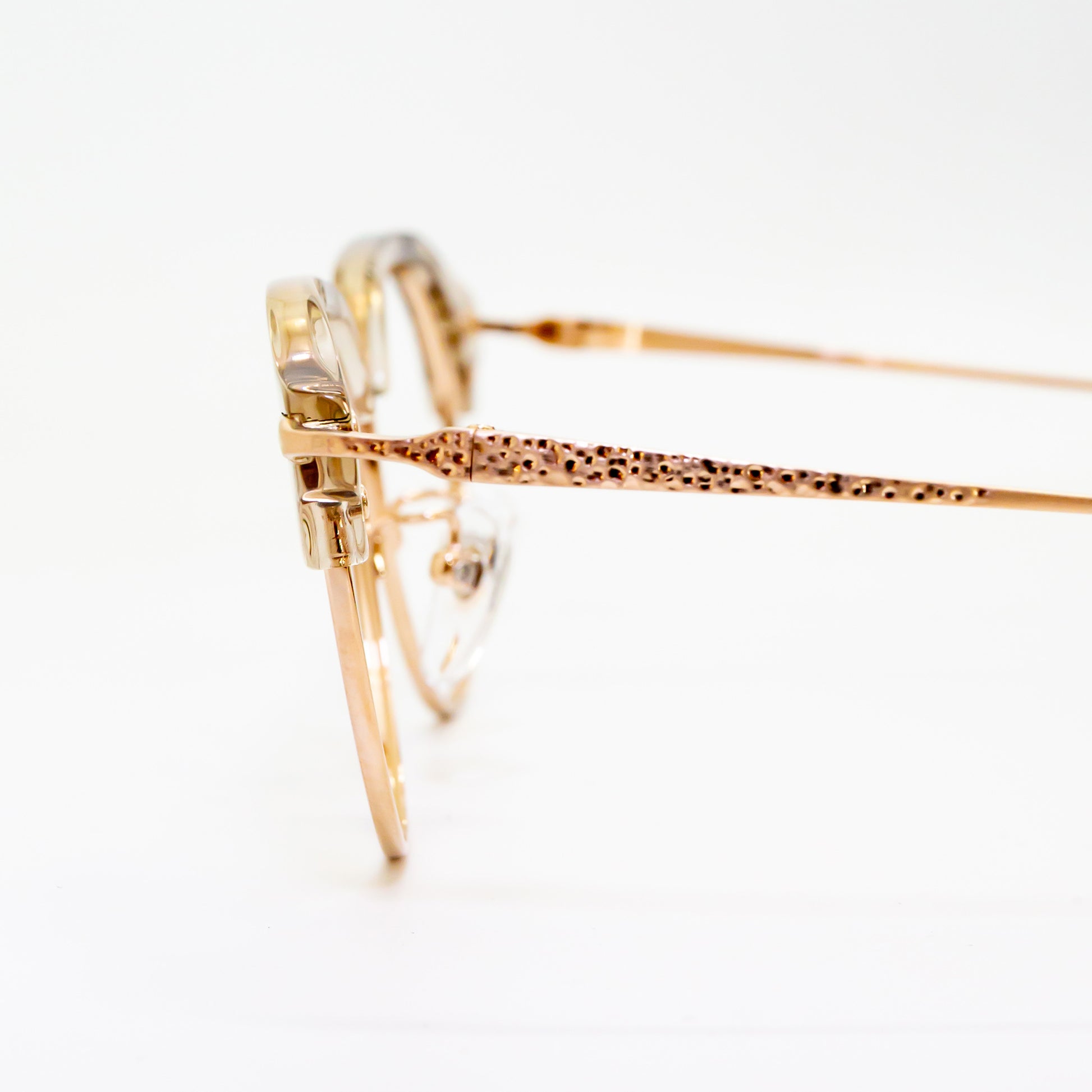 このブランドは、鯖江の伝統的な眼鏡加工技術を最大限に活かしています。冷間プレスによるチタン材加工では、しっかりとした強度と粘りを実現。さらに、精密なマシニング機械の加工と職人の手技による槌目模様が特徴で、機械では再現できない独特の質感を生み出しました。