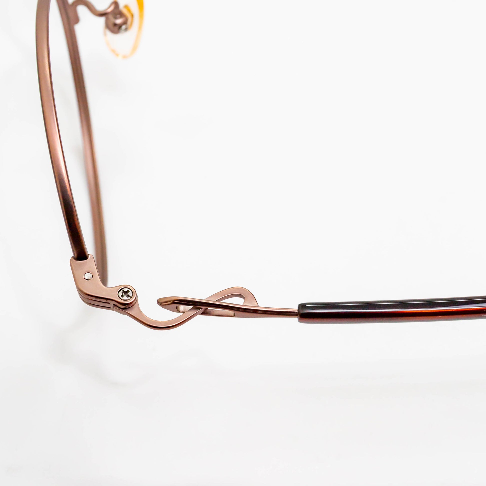 S字の形状を智に施し、フロントとテンプルのつなぎ部分に弾性を持たせることで掛けた時の負担を軽減しています。