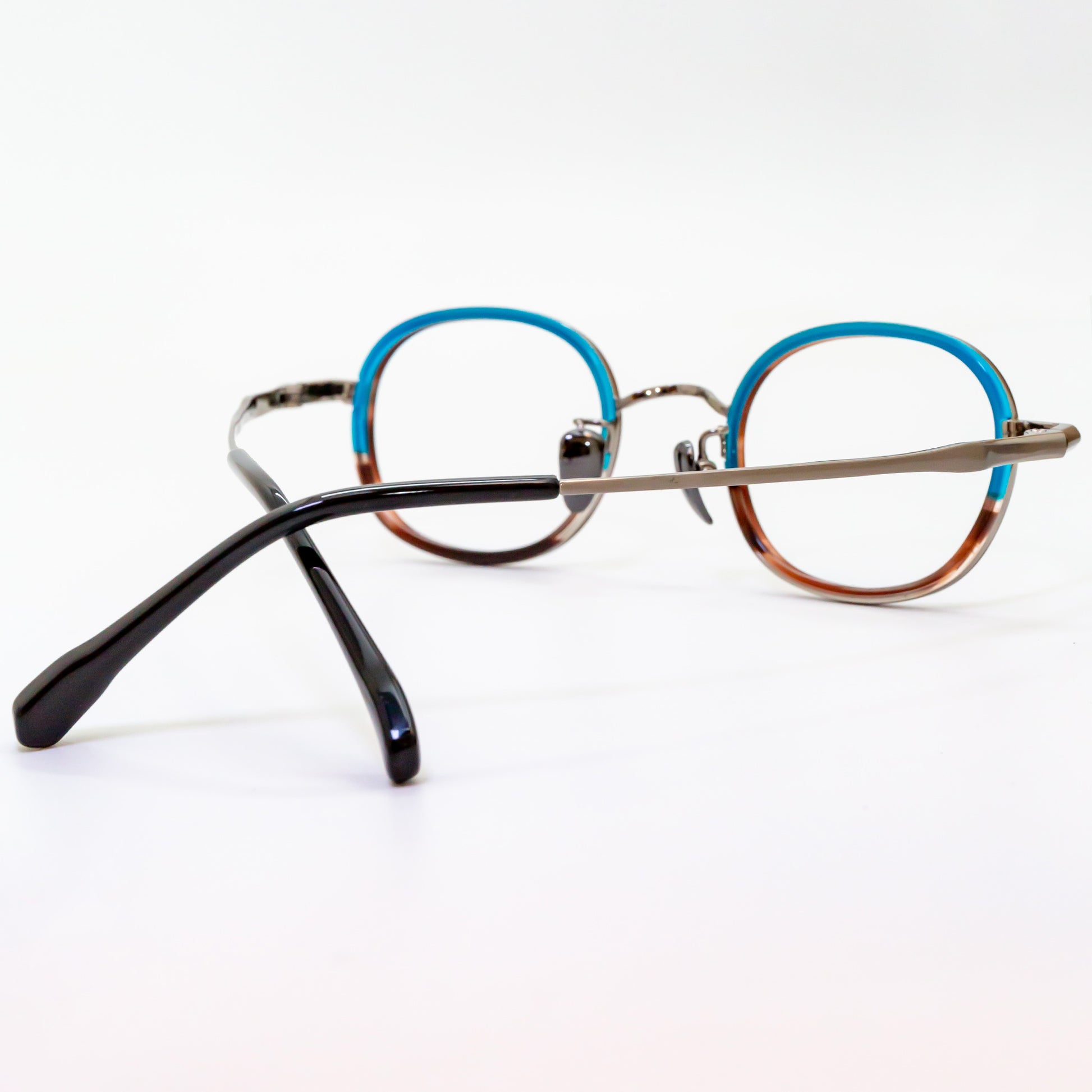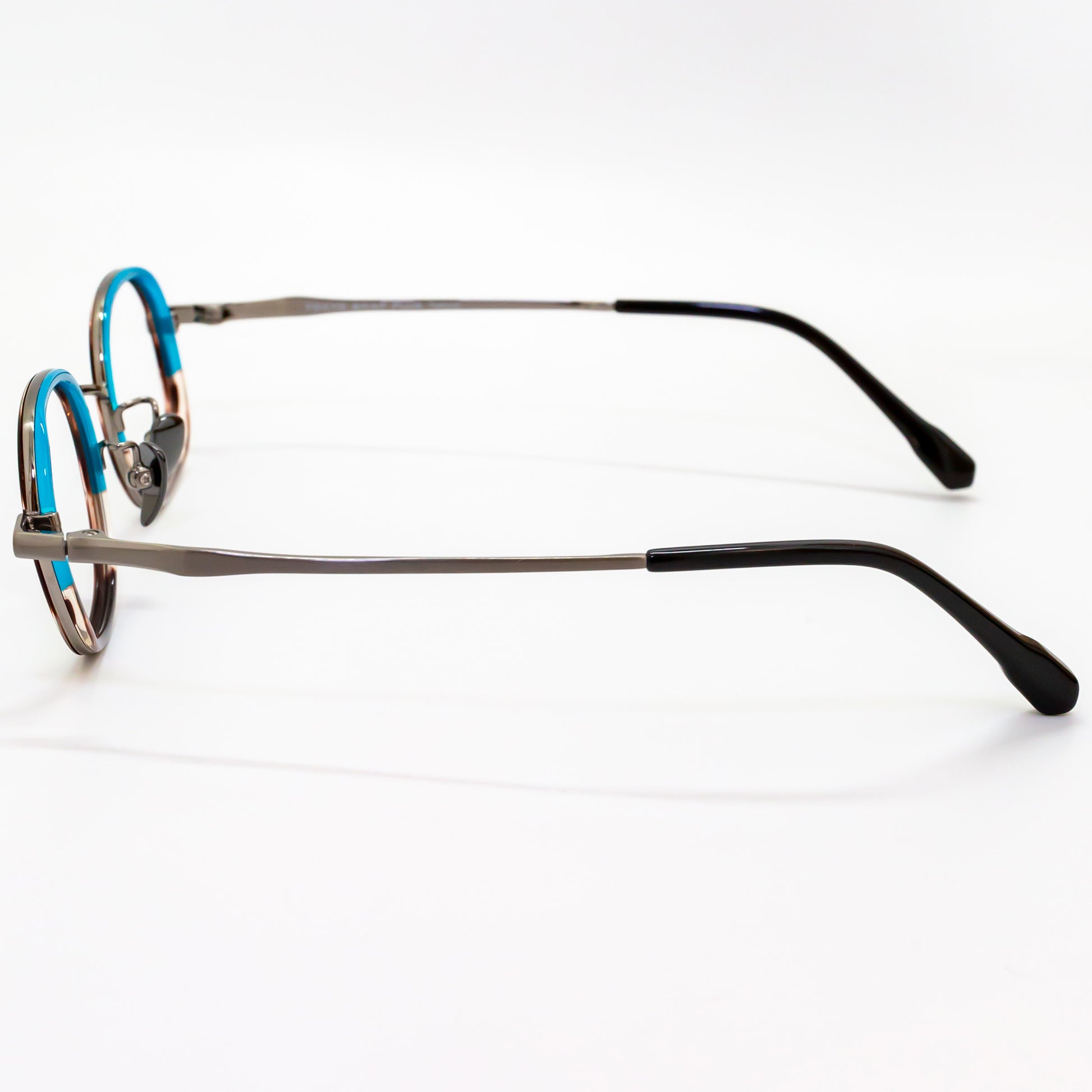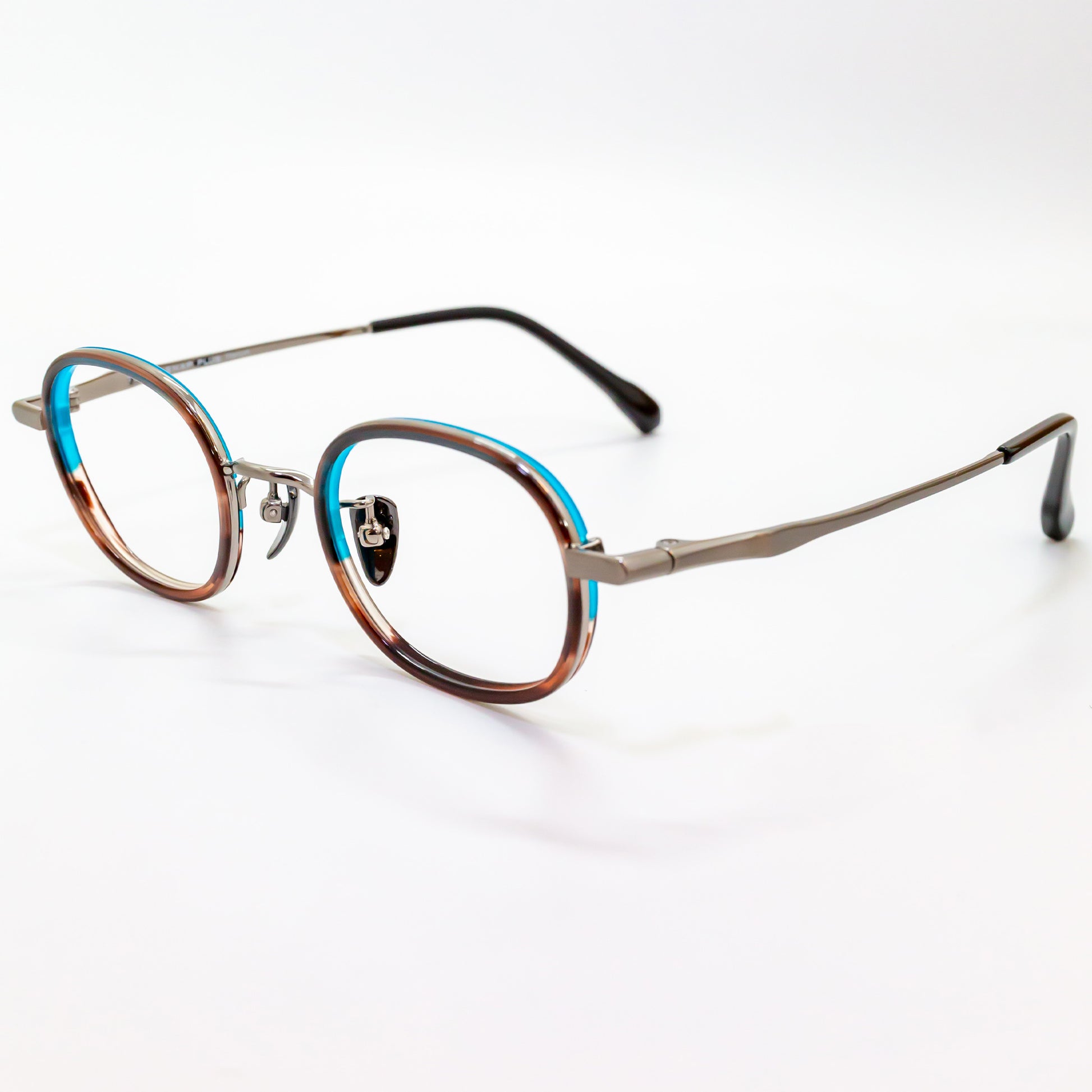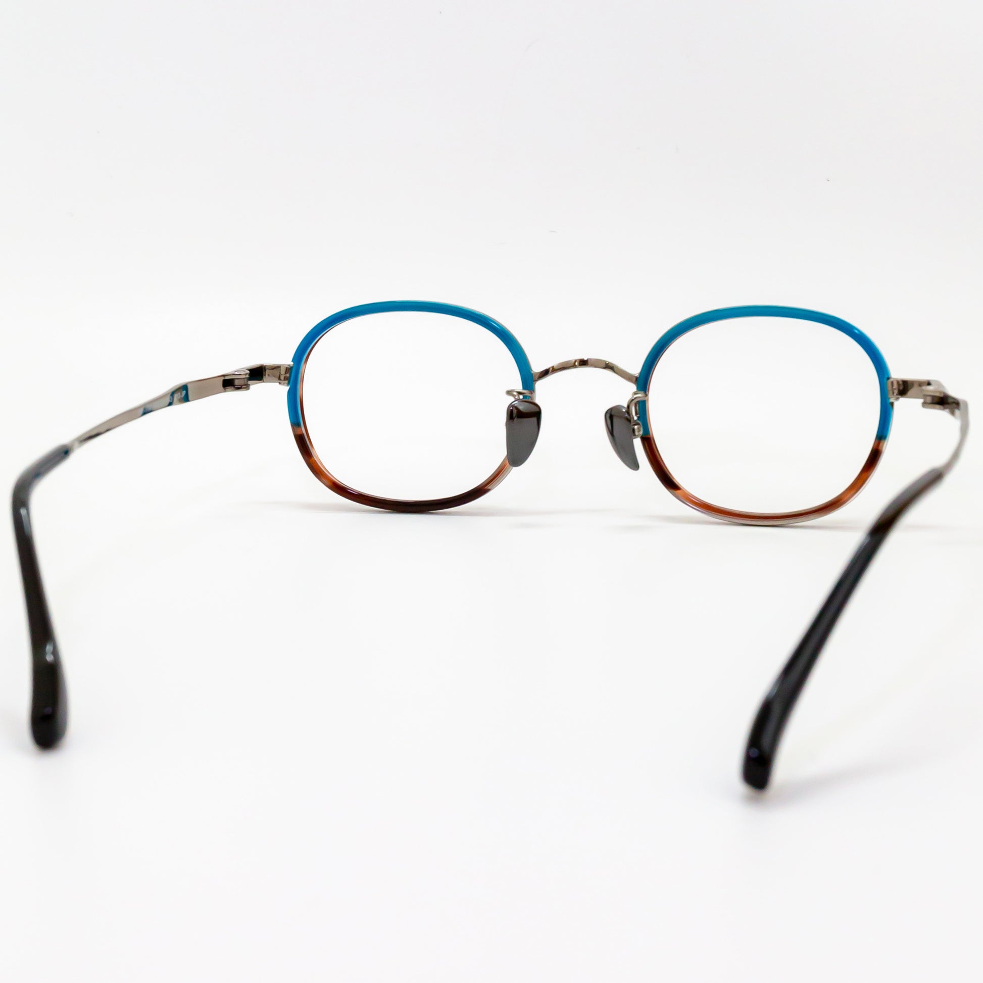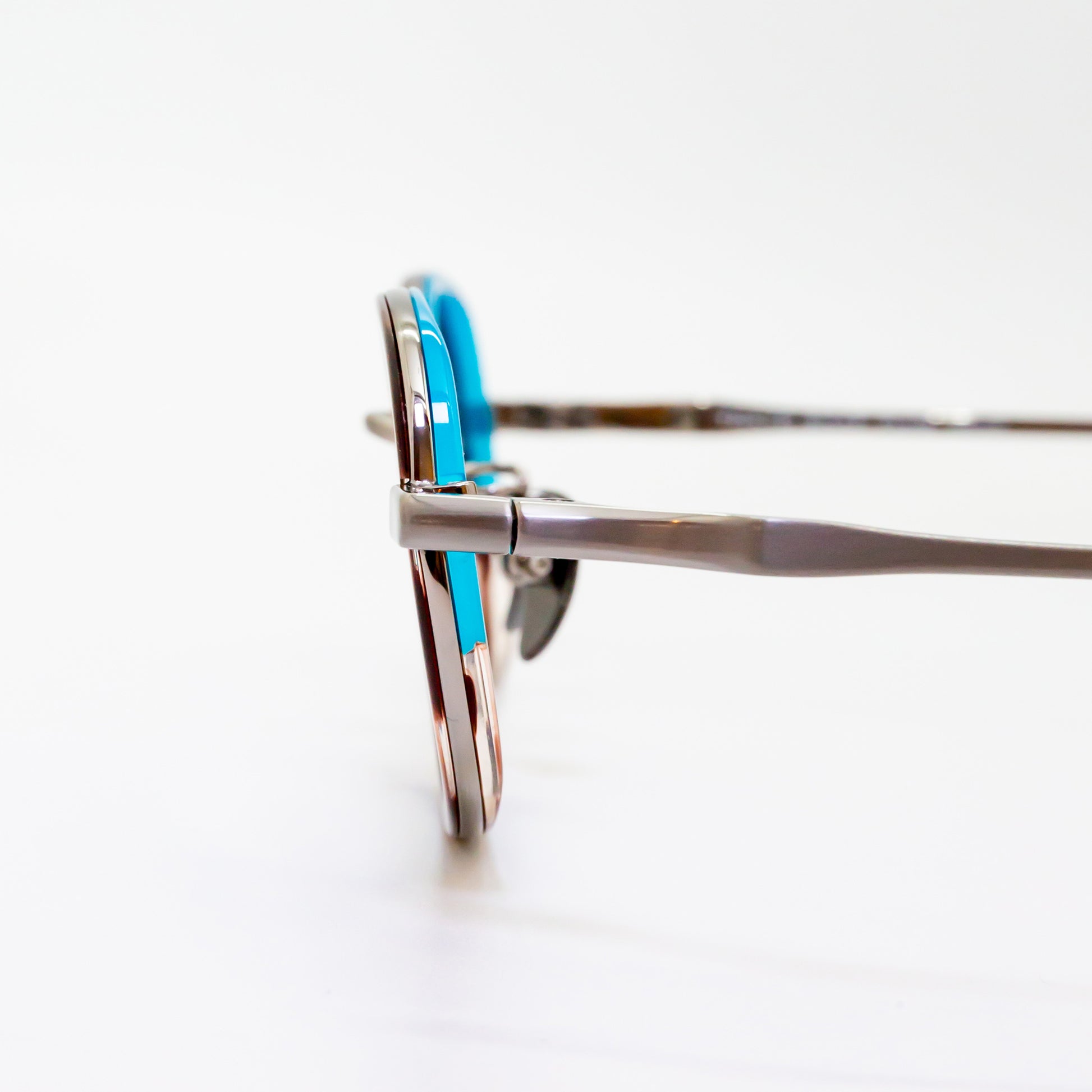 チタン製のテンプルはライトガンメタルカラーで仕上げられ、全体を引き締めるようなシャープさを演出。細身ながらも存在感のあるデザインで、横顔をスタイリッシュに彩ります。