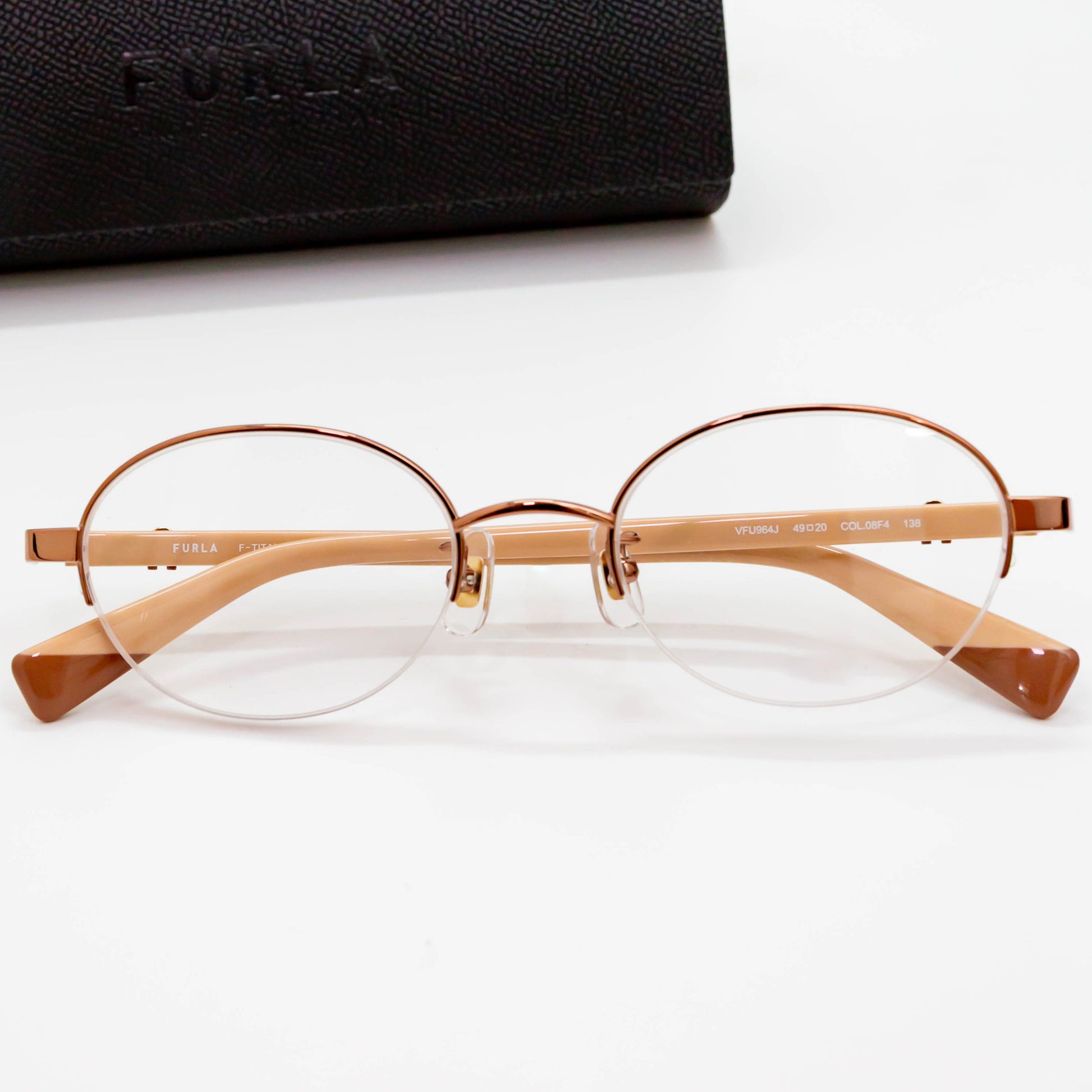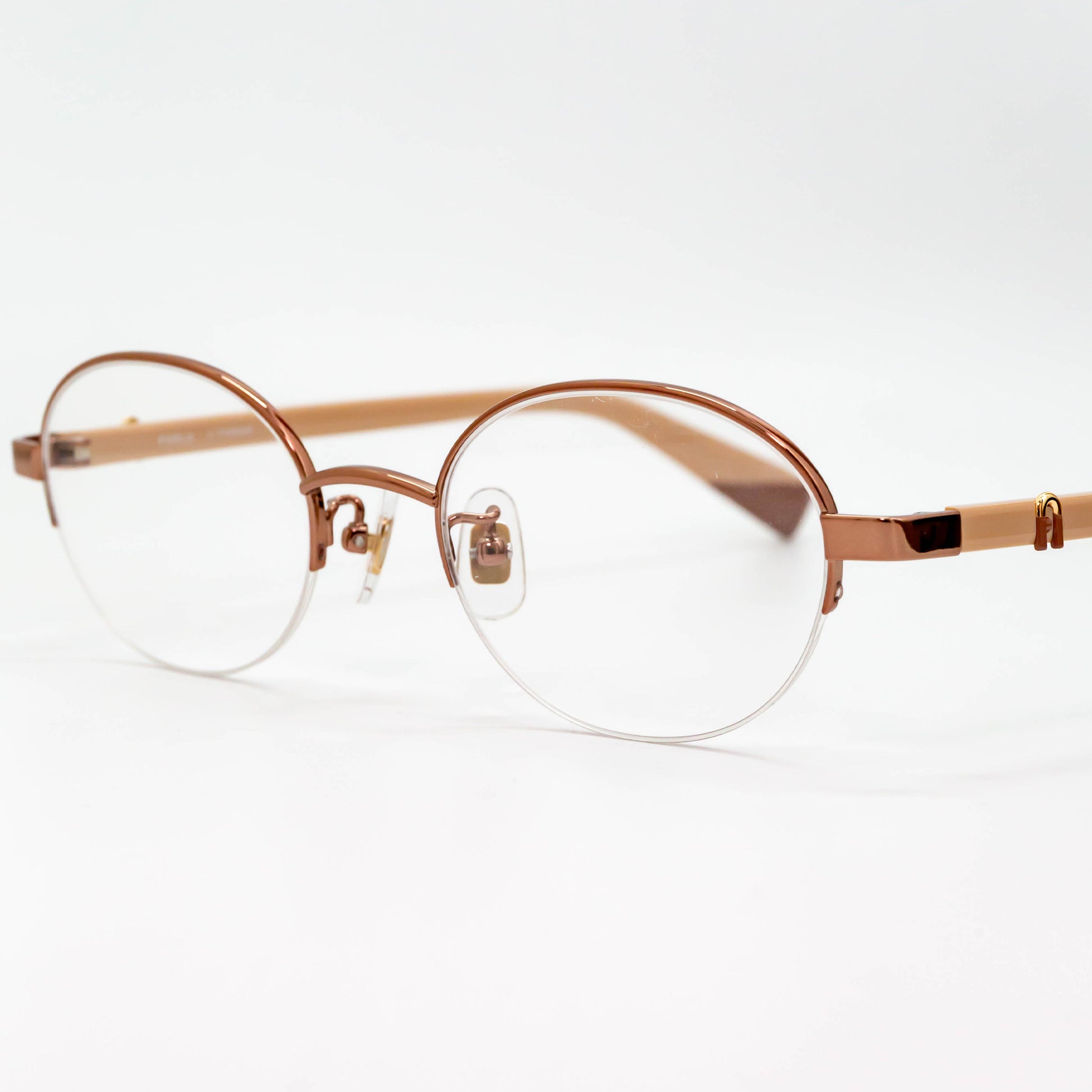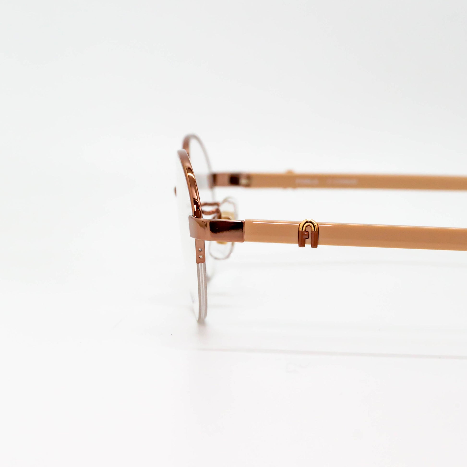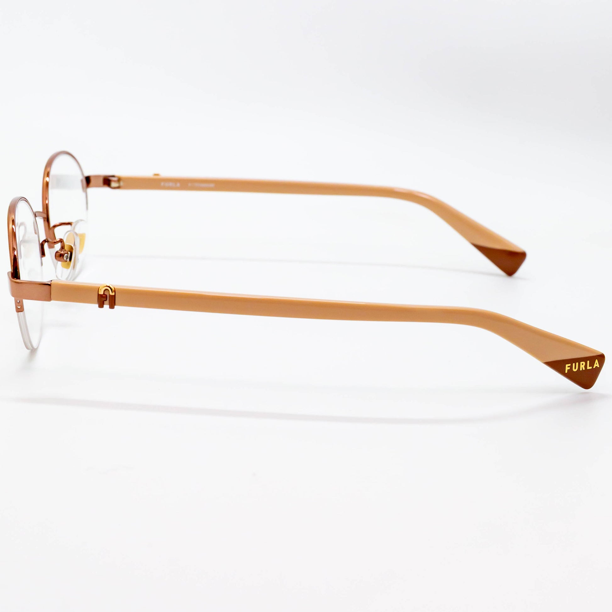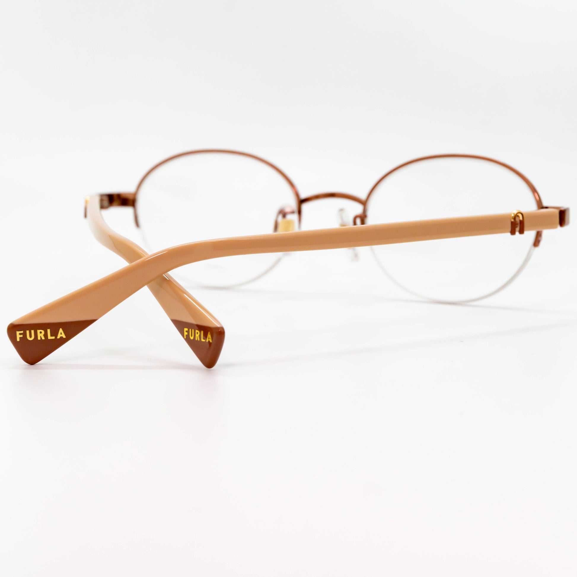 洗練されたウェリントンシェイプのアセテート素材を使用したモデルで、シンプルさとデザイン性を兼ね備えています。フロント部分はシンプルながら、変形テンプルがアクセントとして際立つデザインになっています。特に、クリア生地を通して見える「FURLA」のロゴとアーチロゴがデザインされたテンプル芯やヒンジが特徴的で、高級感を引き立てています。