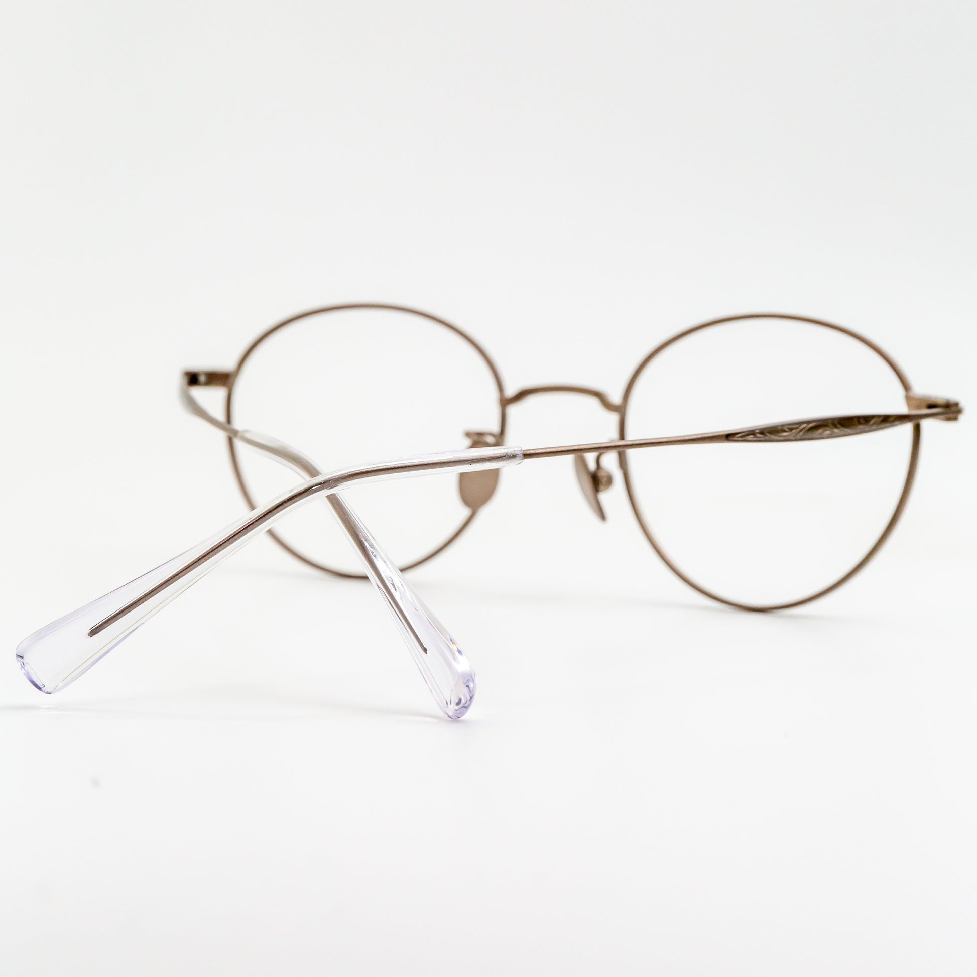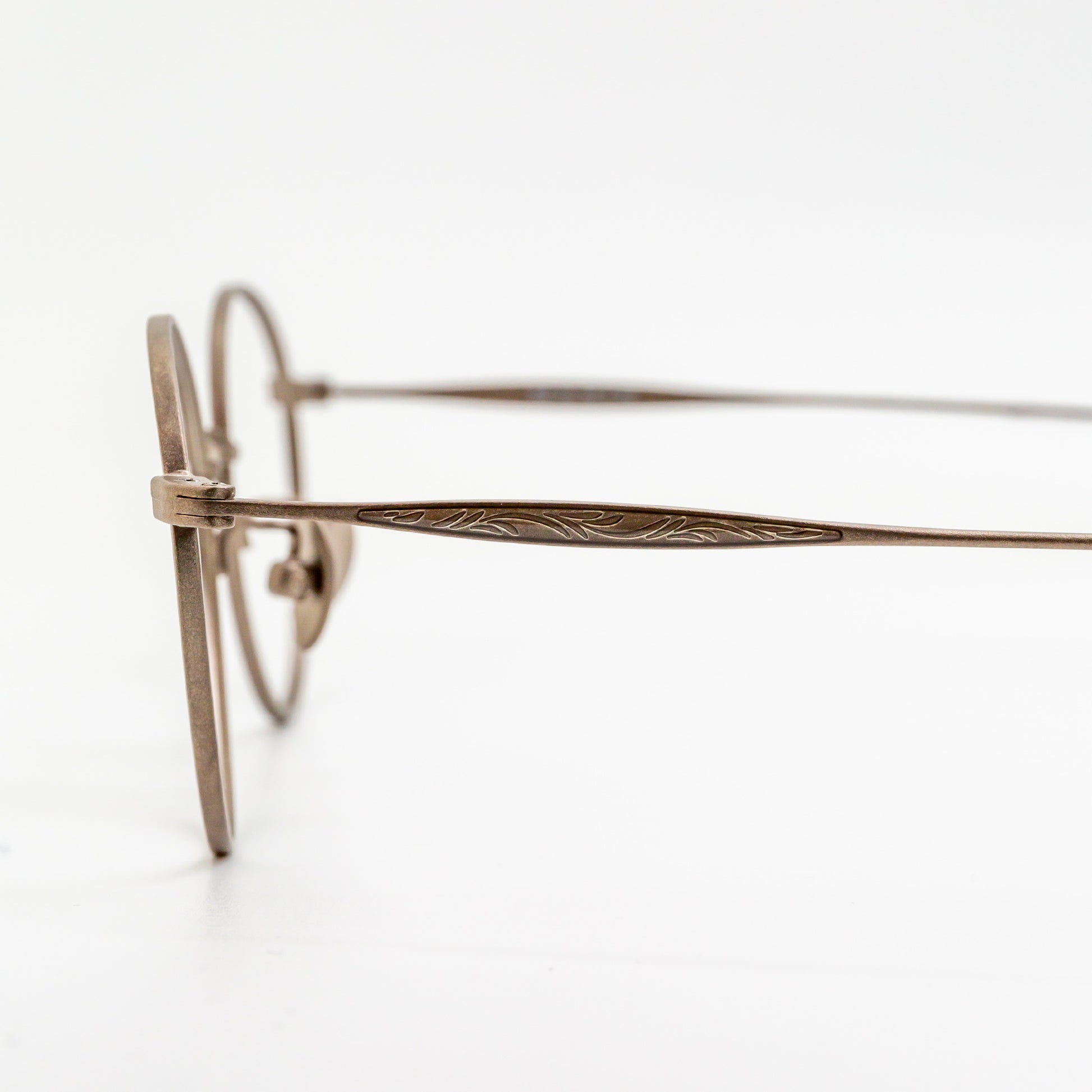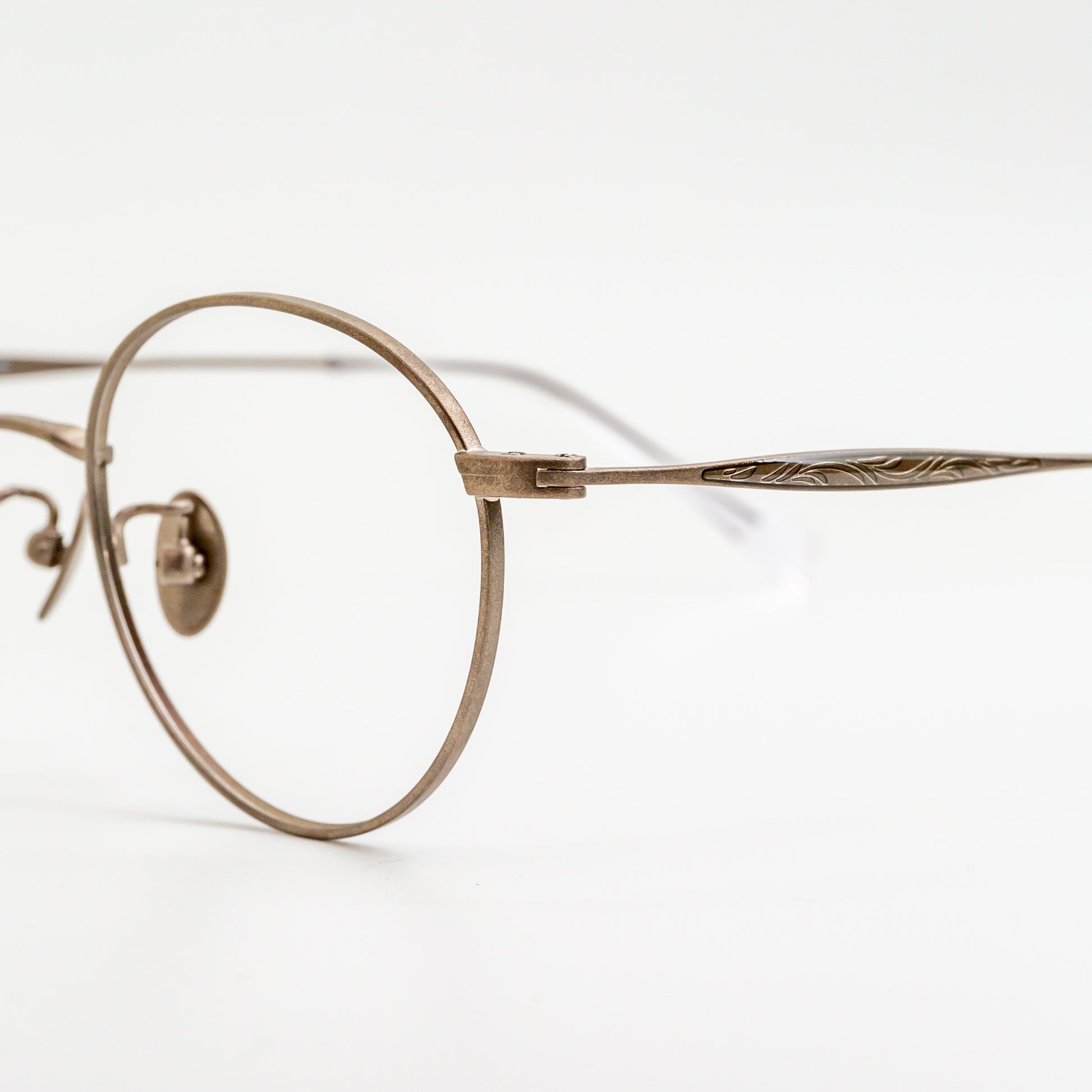 フレームはあえてメッキはつけずに、素材の魅力を感じるサスティナブルなチタン無垢仕上げにしました。七宝で覆われ、奥深い表情をみせるテンプル彫金模様です。