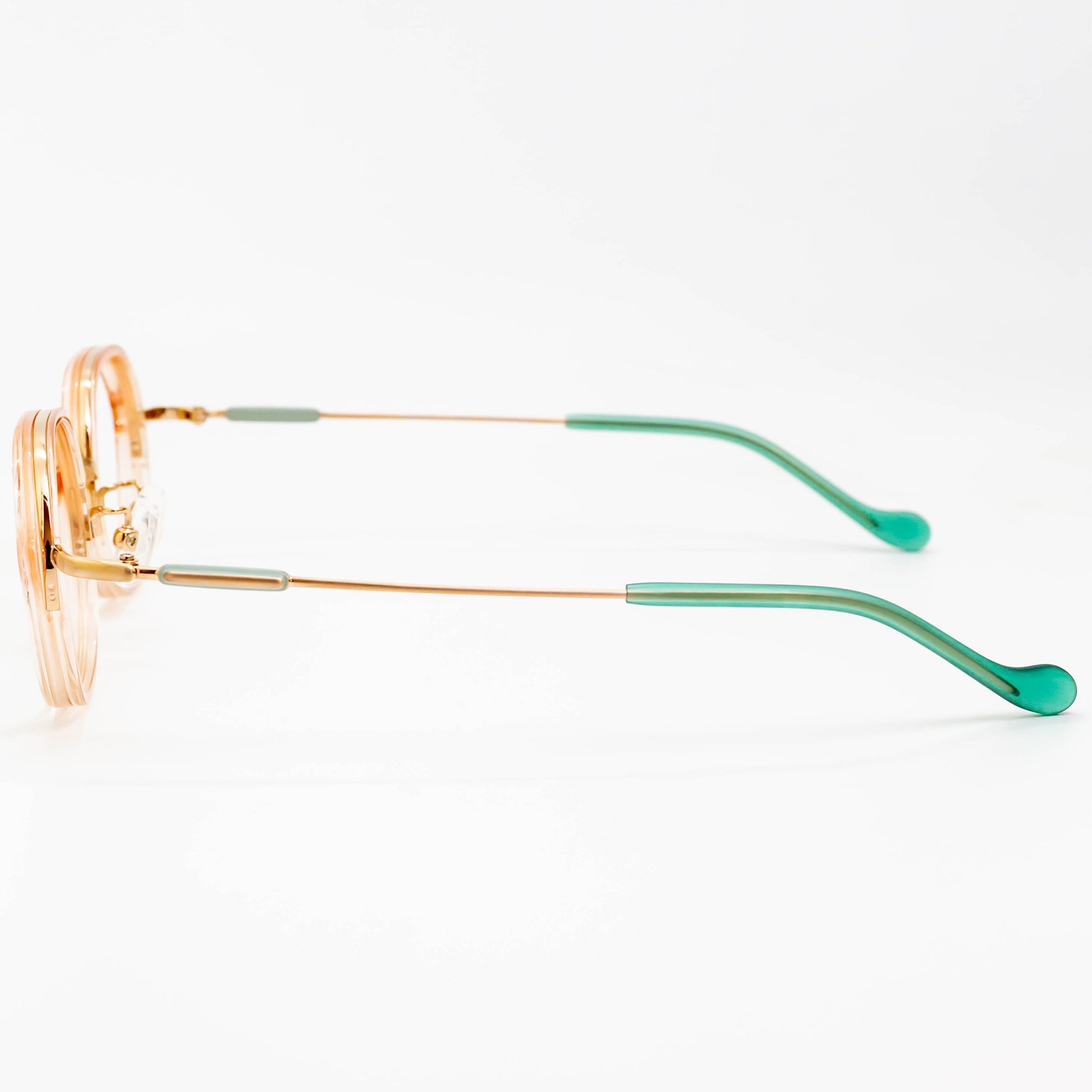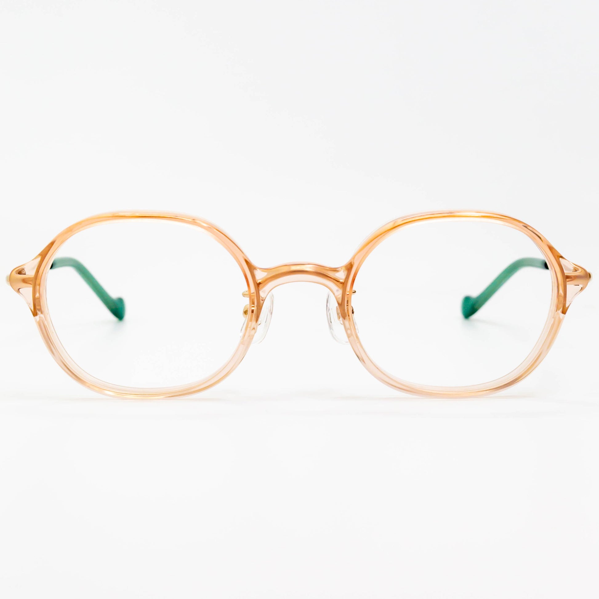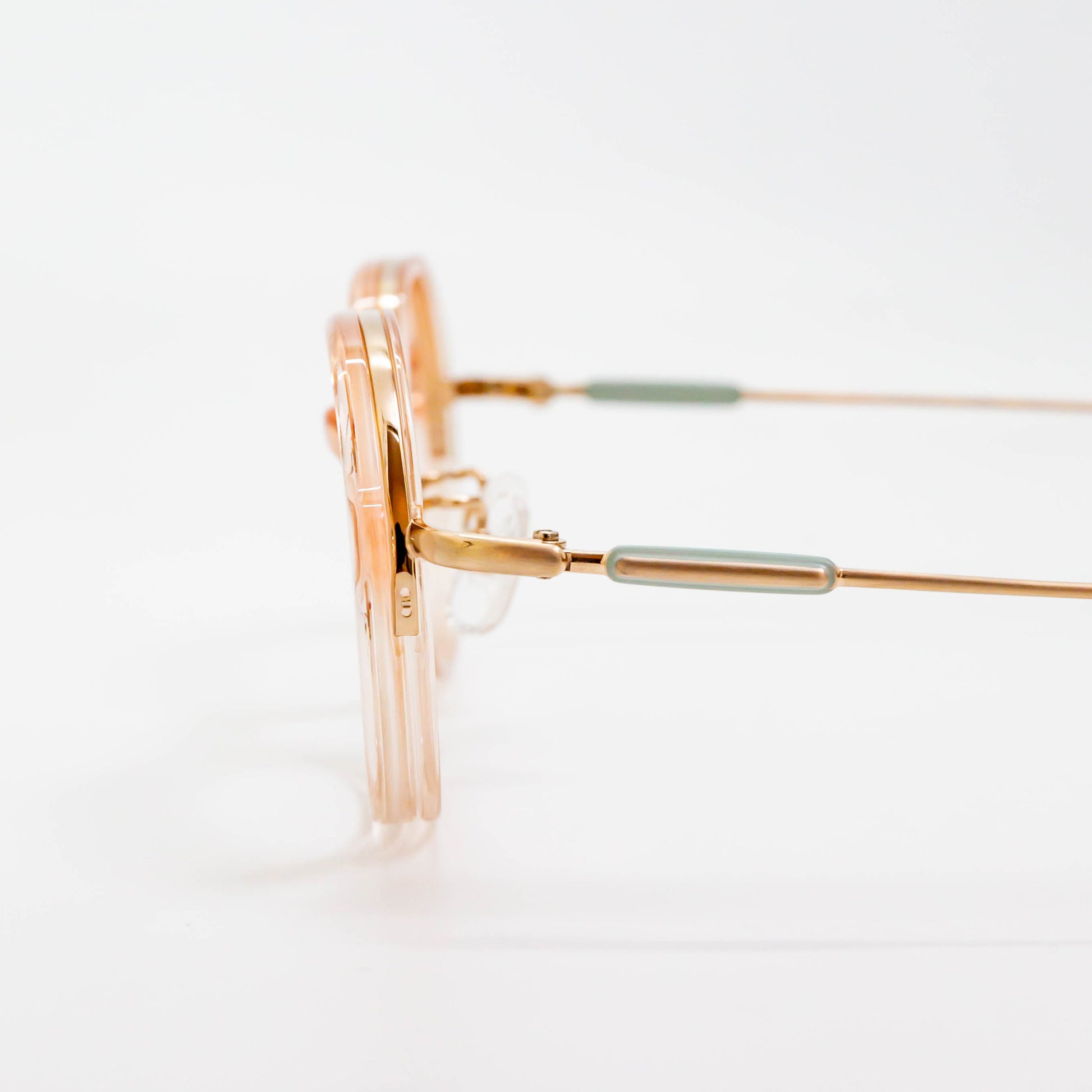 クリア感のある乳白色のアセテートパーツはころんと丸みをつけることでかわいらしさがあり、レンズの厚みが目立たないようにも配慮されています。