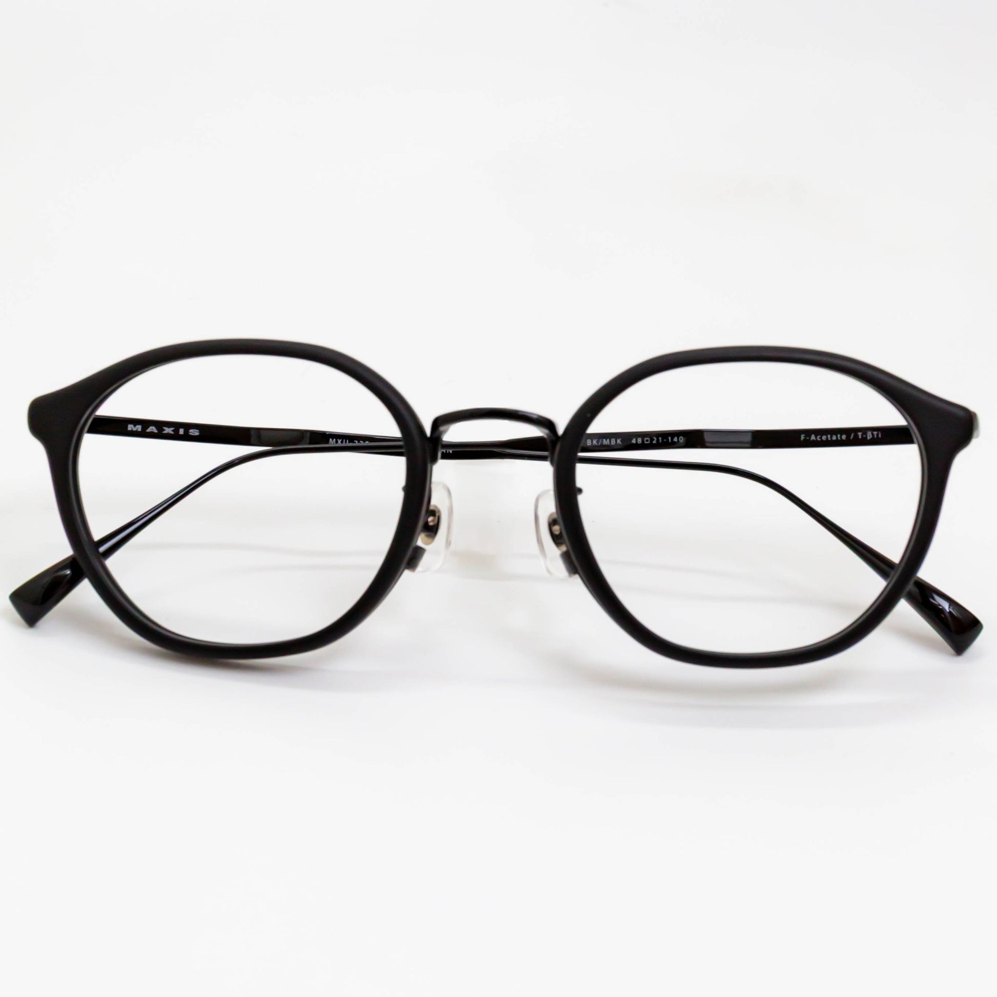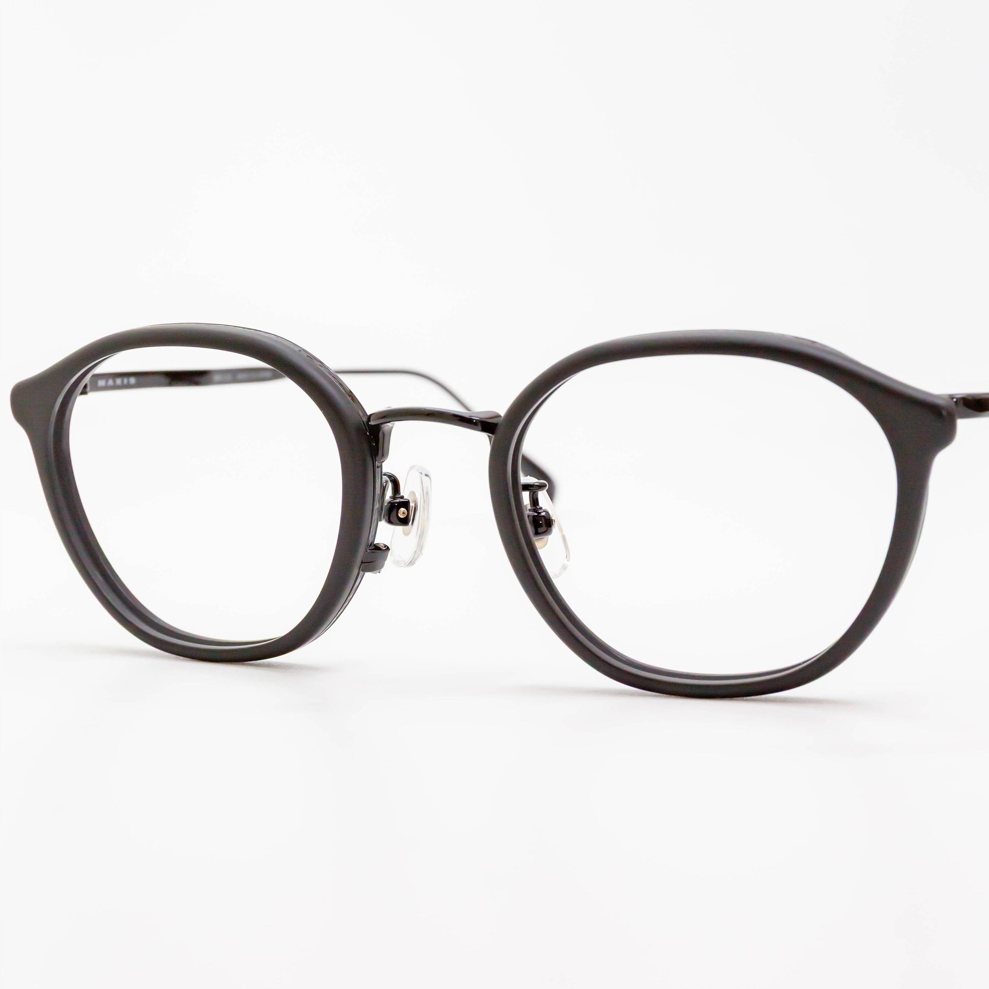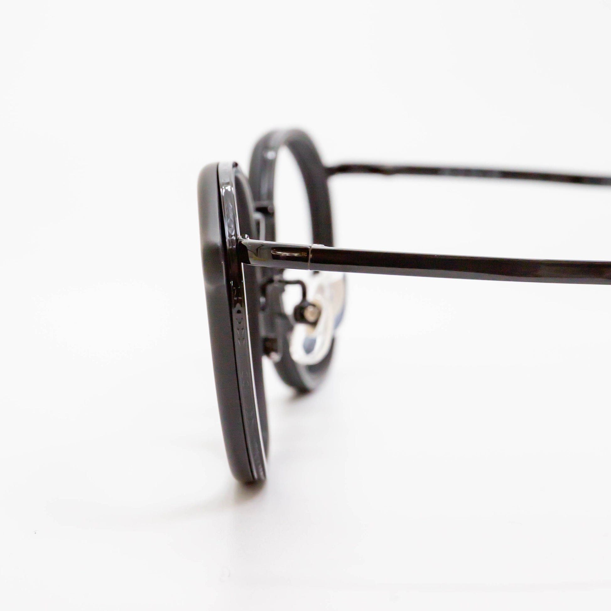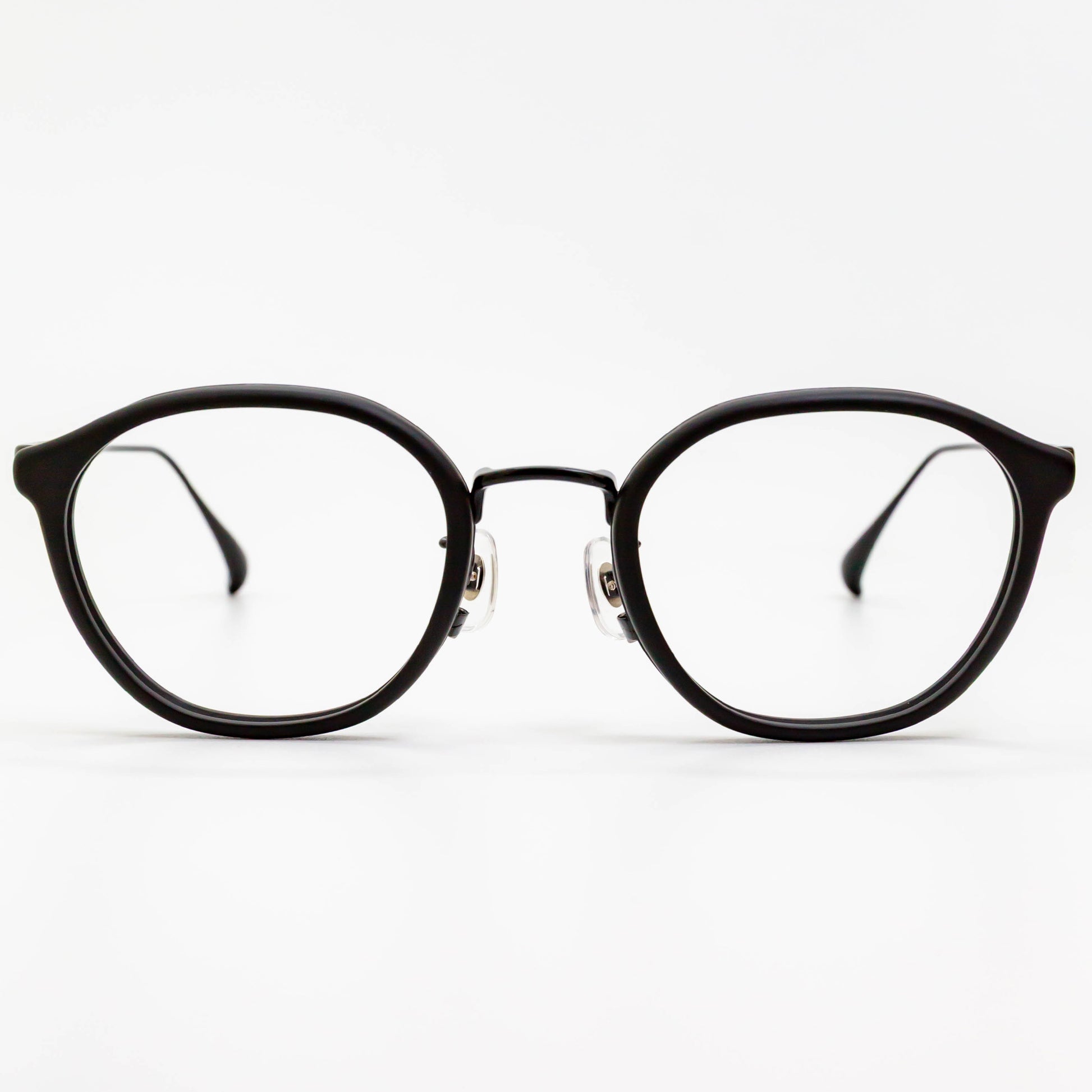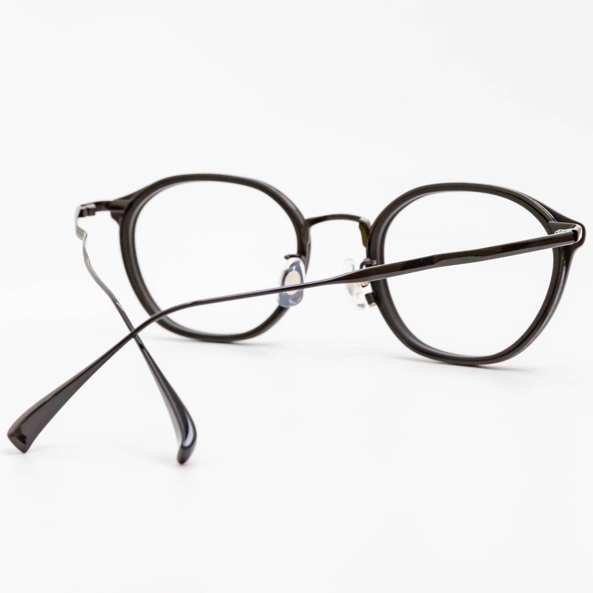 クールなメタルフレームに、ふっくらとしたセル輪をはめた、多角形のコンビフレーム。セル輪とメタルフレームのコントラストが、高級感のある大人のかわいらしさを演出する。